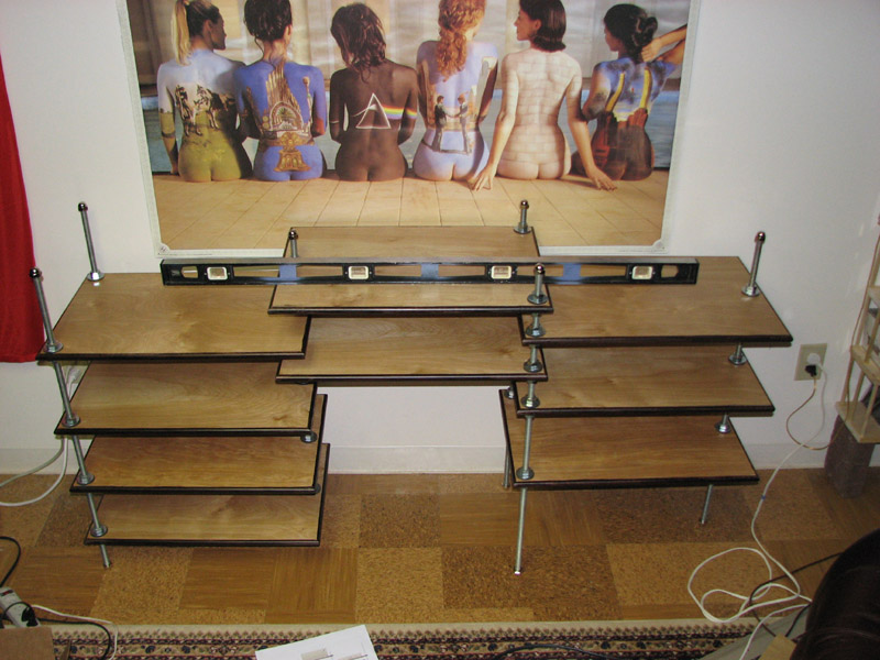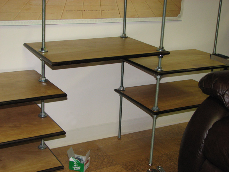 All shelves in place, acorn nuts used to cover the upper end of the threaded rods
