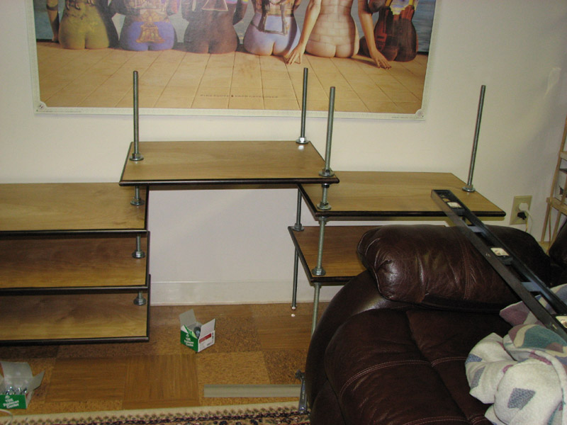 Test fitting a shelf, checking for level (observe acorn nuts as feet)